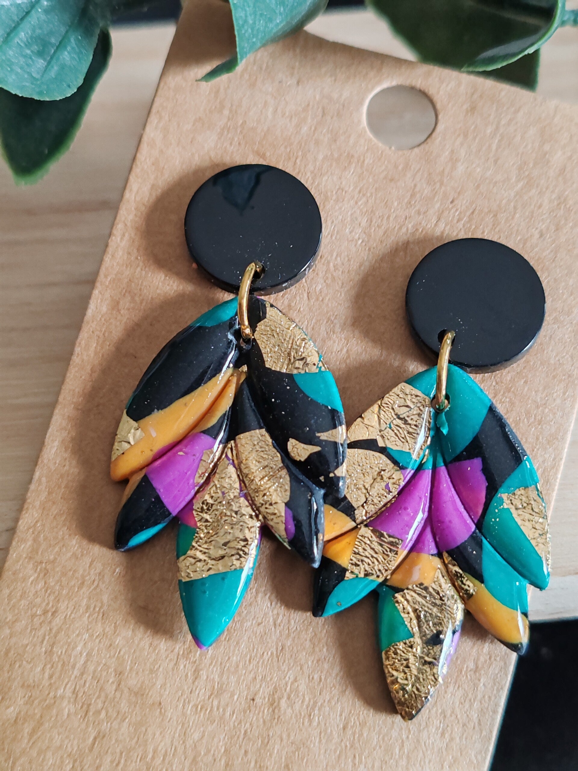 Boucles d’oreilles en pâte polymère – Noir Galaxy, Violet Néon, Vert Jungle & Orange Sunset