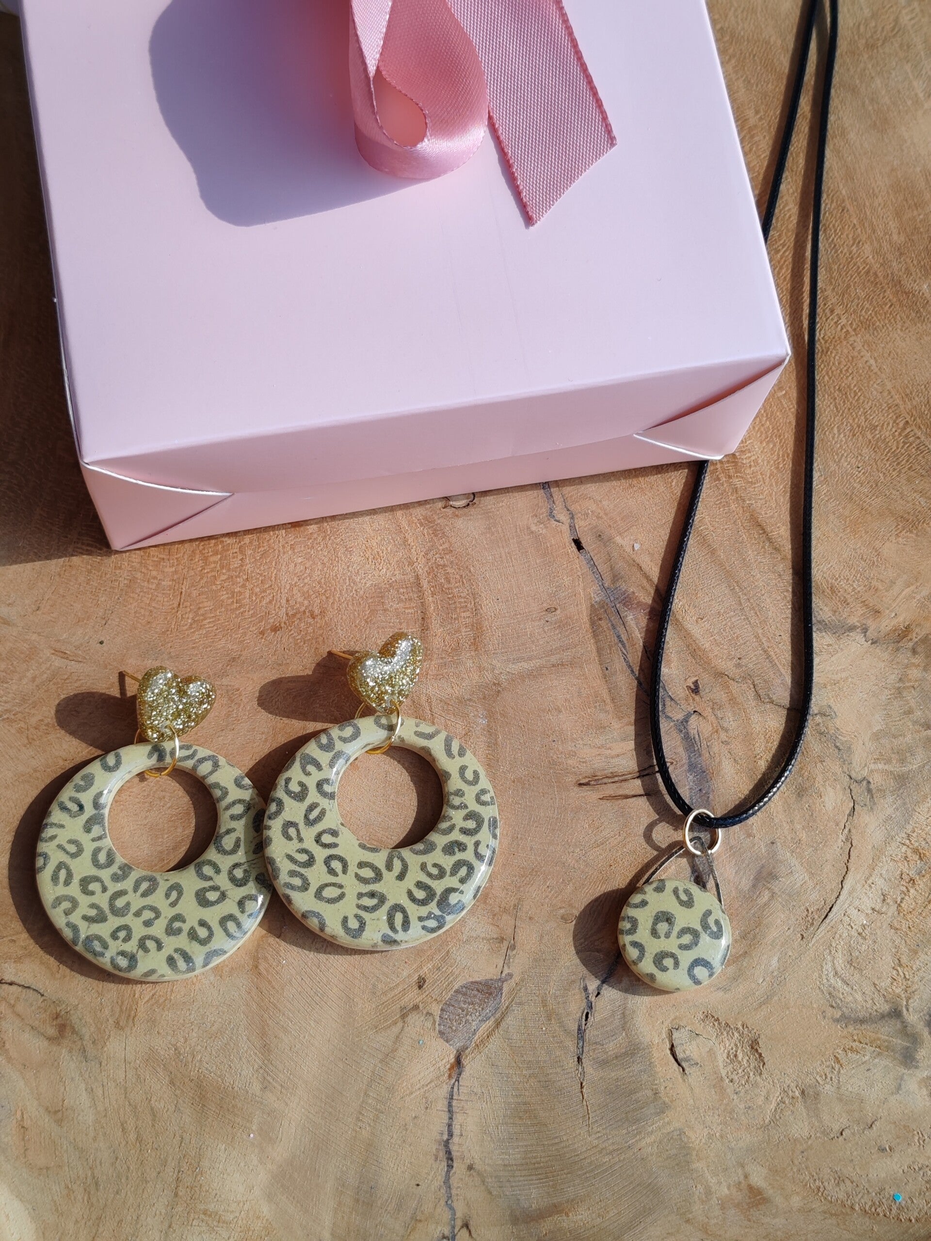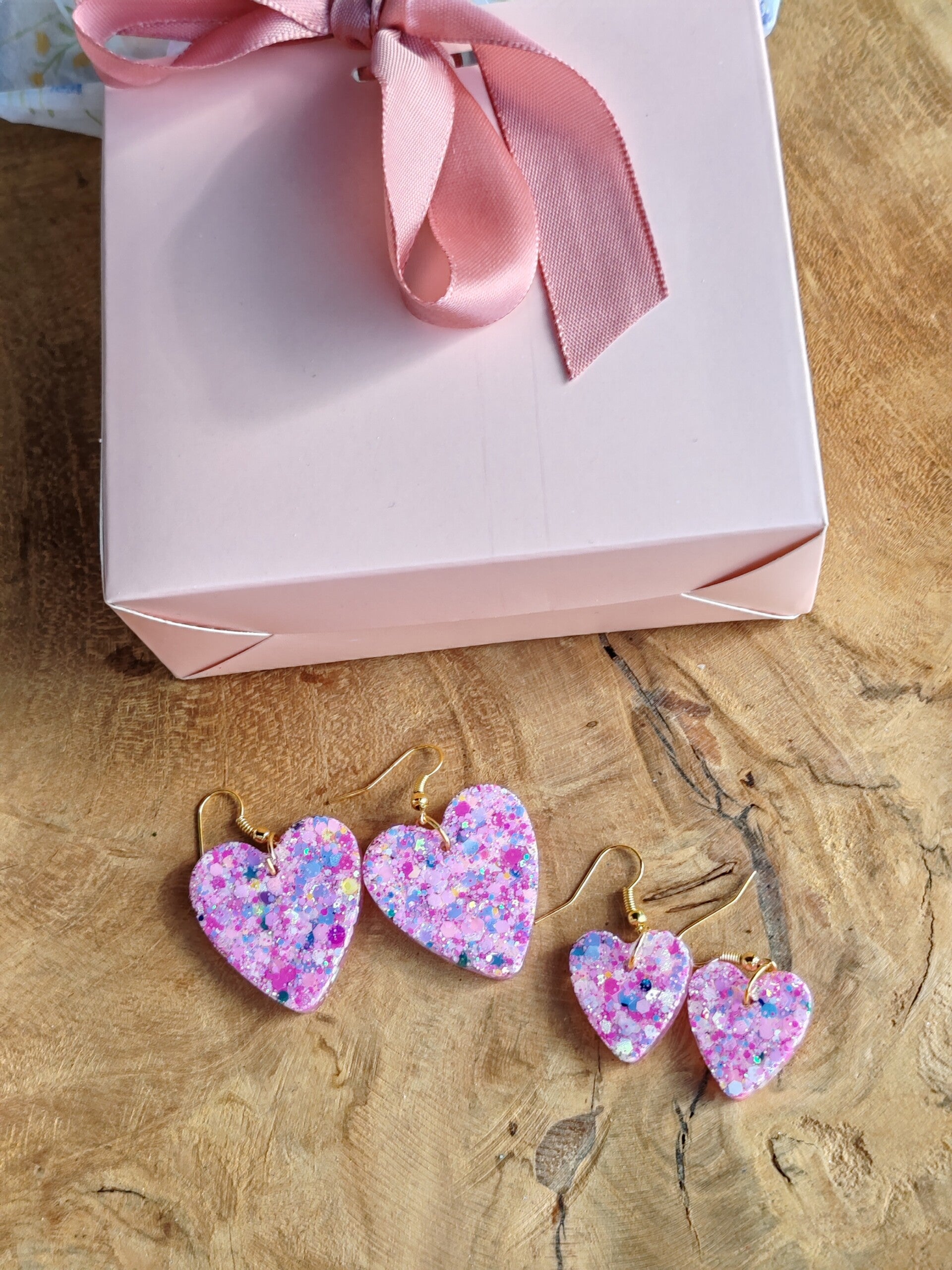 Option Mère-Fille (+10€) : ajoutez 2 paires de boucles d’oreilles en résine pailletée (blanche ou rose, en forme de cœur) pour un cadeau complice à partager.