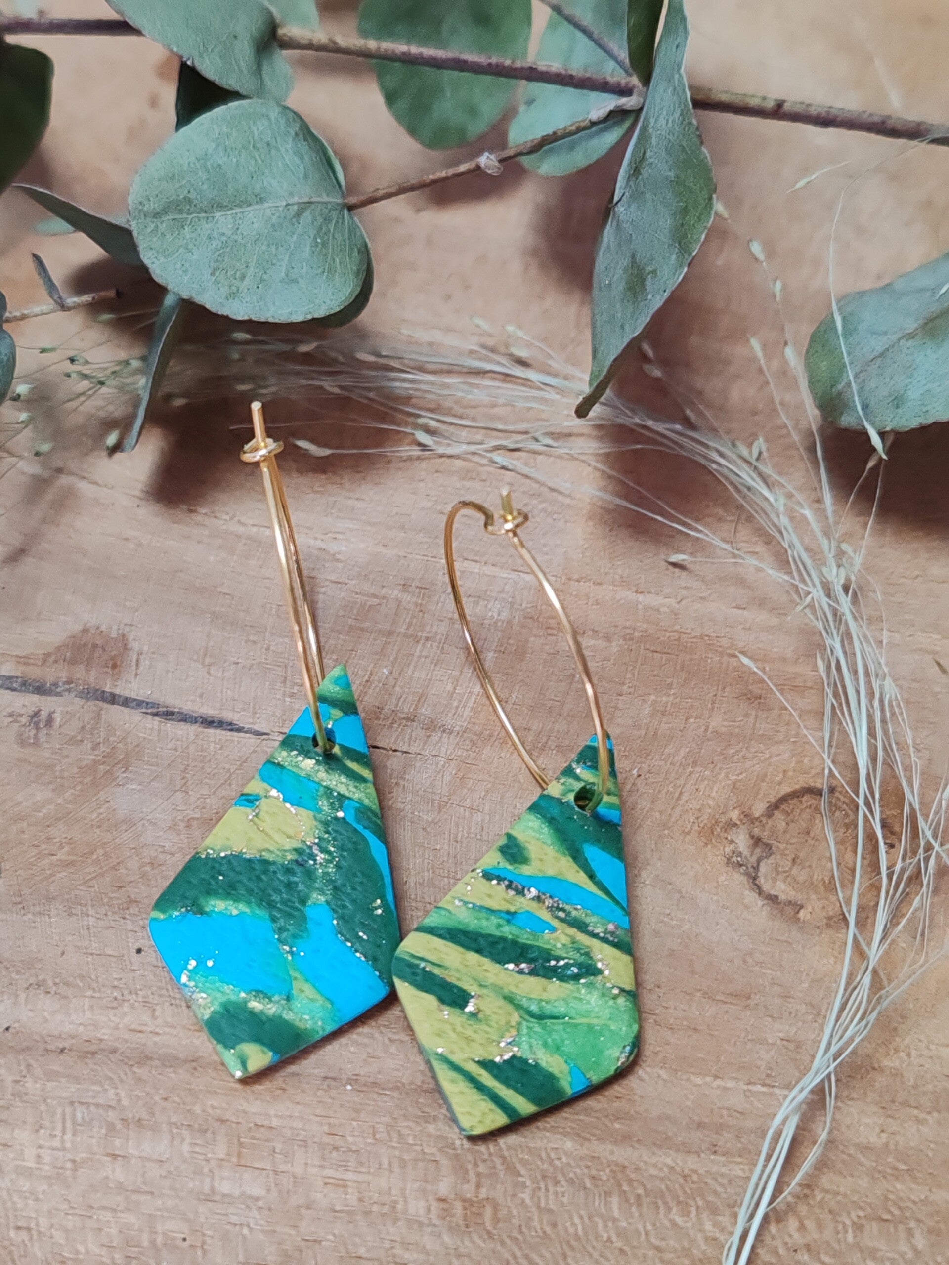 Apportez une touche de fraîcheur et d’originalité à vos tenues avec ces boucles d’oreilles en pâte polymère vert turquoise. Entièrement façonnées à la main, elles associent un vert profond et un turquoise éclatant, relevés de touches dorées pour un rendu élégant et lumineux.