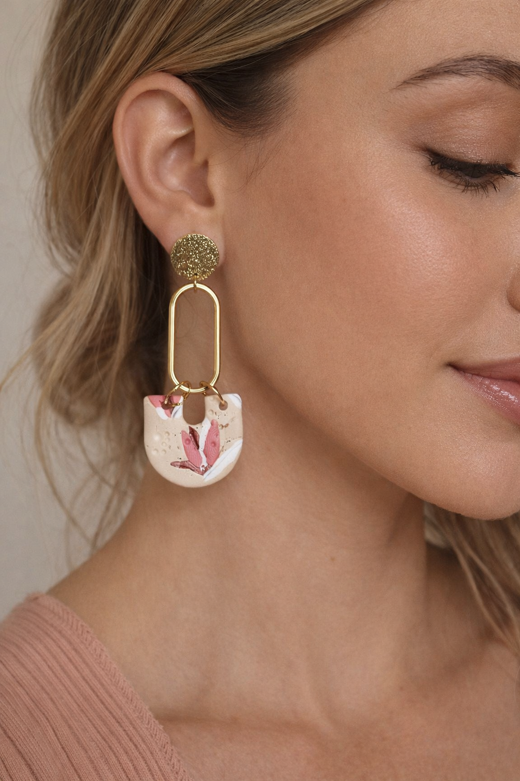 Boucles d’oreilles en pâte polymère faite main, aux tons beige, rose, blanc et bordeaux, sublimées par une structure ovale dorée moderne.