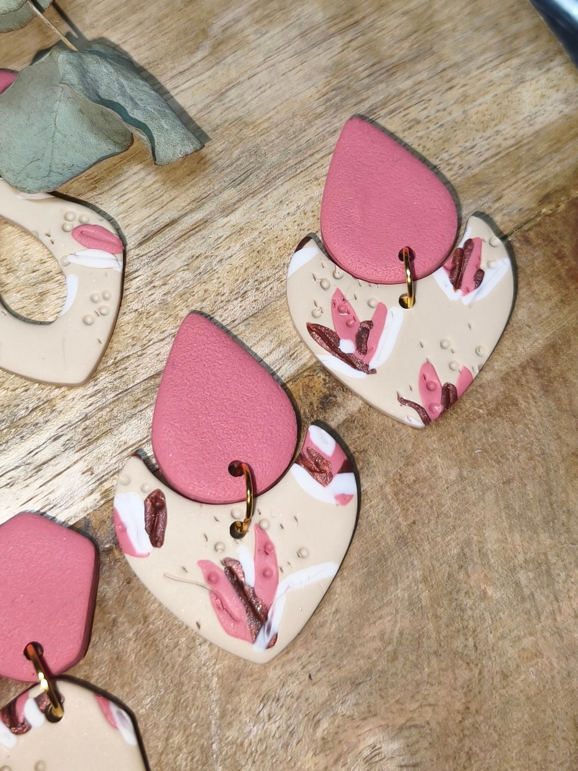 Boucles d’oreilles en pâte polymère faite main, composées d’une goutte rose texturée associée à une pièce beige au motif floral moderne dans des tons rose, blanc et bordeaux.