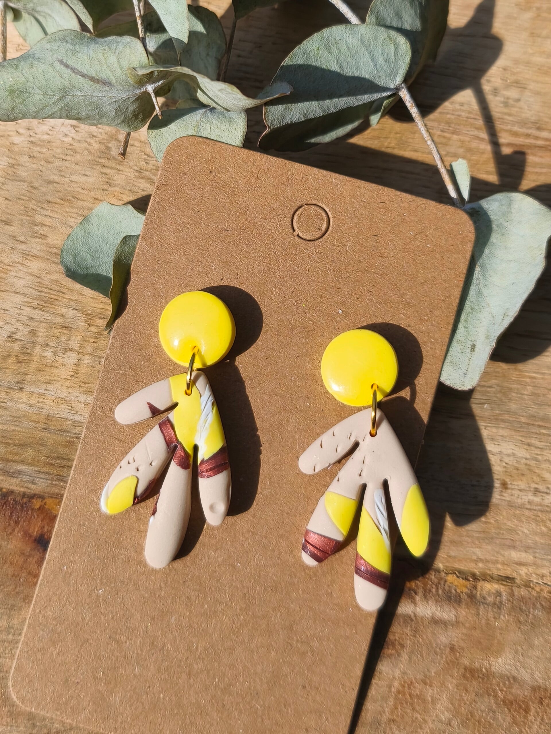 Boucles d’oreilles en pâte polymère faite main, composées d’une goutte jaune texturée associée à une pièce beige au motif floral moderne dans des tons jaune, blanc et bordeaux.