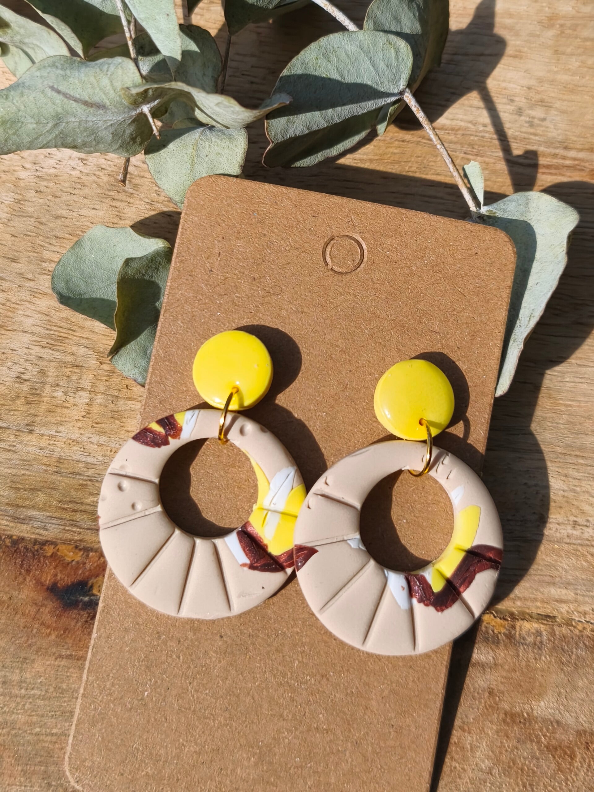 Boucles d’oreilles en pâte polymère faite main, composées d’une goutte rose texturée associée à une pièce beige au motif floral moderne dans des tons jaune, blanc et marron.